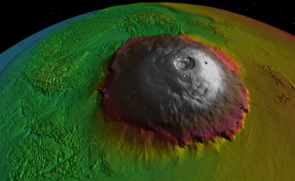 Marte este prevazuta nu doar cu cea mai adanca vale din Sistemul Solar, ci si cu cel mai inalt masiv montan. Vulcanul martian Olimp Mons atinge o altitudine de aproximativ 25.000 de metri, adica este de peste trei ori mai inalt decat Muntele Everest, cel mai inalt masiv de pe Terra. Prodigiosul pisc s-a format, probabil, asemenea vulcanilor pamanteni: aflandu-se deasupra unui „punct fierbinte”, de unde valuri de roca incinsa se ridica dinspre interiorul planetei catre suprafata.