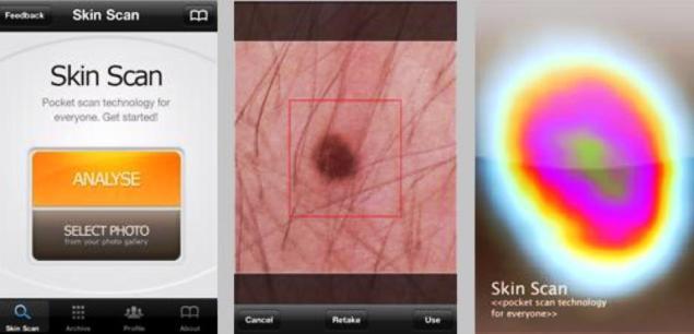 Skin Scan, care funcţionează pe iPhone şi iPod touch, evaluează aspectul unor aluniţe de pe piele, pentru a ajuta la diagnosticarea melanomului malign. O fotografie a aluniţei este analizată conform unor anumiţi parametri, iar monitorizând în timp aspectul aluniţelor, se poate vedea dacă acestea rămân în stadiul beningn sau evoluează malign ( se cancerizează). Malignizarea e însoţită de schimbări ale aspectului aluniţei, deci, suprinzând momentul când aceasta începe să îşi schimbe înfăţişarea într-un mod suspect, utilizatorul poate fi alertat şi îndrumat spre cel mai apropiat cabinet medical de specialitate. Şansele de supravieţuire sunt considerabil mai mari dacă melanomul este diagnosticat şi tratat de timpuriu.