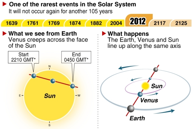 Zilele de 5 şi 6 iunie 2012 sunt extrem de importante pentru astronomii din întreaga lume, ele marcând ultima oară când oamenii aflaţi astăzi în viaţă au şansa să fie martori la un eveniment foarte rar: tranzitul lui Venus, evenimentul în care cel mai luminos astru al nopţii se interpune pentru câteva ore între Pământ şi Soare, de pe Terra văzându-se ca un mic disc negru. Acest moment astronomic urmează să se repete abia în decembrie 2117.