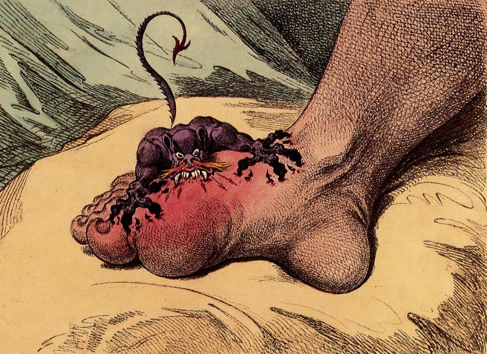 Guta (sau podagra, cum se numelte când este loca este cauzată de o tulburare a metabolismului ce produce acumularea de acid uric în organismul uman. Acidul uric în exces se depune sub formă de cristale în articulaţii, determinând inflamarea acestora, manifestată sub forma unor crize extrem de dureroase (evocate sugestiv în această ilustraţie din 1799).
