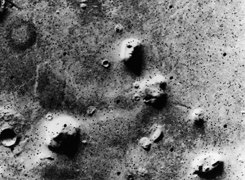 Timp de peste un deceniu, cel mai vizibil si mai zgomotos promoter al teoriilor despre orasele martiene si lunare de odinioara a fost Richard C. Hoagland, autor de lucrari stiintifice. La mijlocul anilor ’80, Hoagland a strans o echipa de oameni de stiinta pentru a analiza un enigmatic obiect asemanator Sfinxului, prezent in mai multe dintre fotografiile planetei Marte, realizate de NASA. „Chipul de pe Marte”, cum este cunoscuta formatiunea ciudata, a ajuns oficial in analele istoriei conspiratiilor in vara lui 1976, atunci cand nava spatiala Viking 1 parcurgea, pentru a 35-a oara, o rotatie pe orbita in jurul Planetei Rosii. In timp ce facea fotografii ale unei regiuni desertice numite „Cydonia”, la o altitudine de circa 1.600 km de suprafata martiana, Viking 1 a inregistrat pe pelicula o imagine extrem de neobisnuita: o forma geografica ce se intindea pe 1,5 kilometri semana cu vederea frontala a unei fete umane sau, cel putin, a unei fete de umanoid. In cele doua imagini neclare, care de atunci au devenit celebre, „chipul” pare sa aiba intr-adevar ochi, nas si gura.