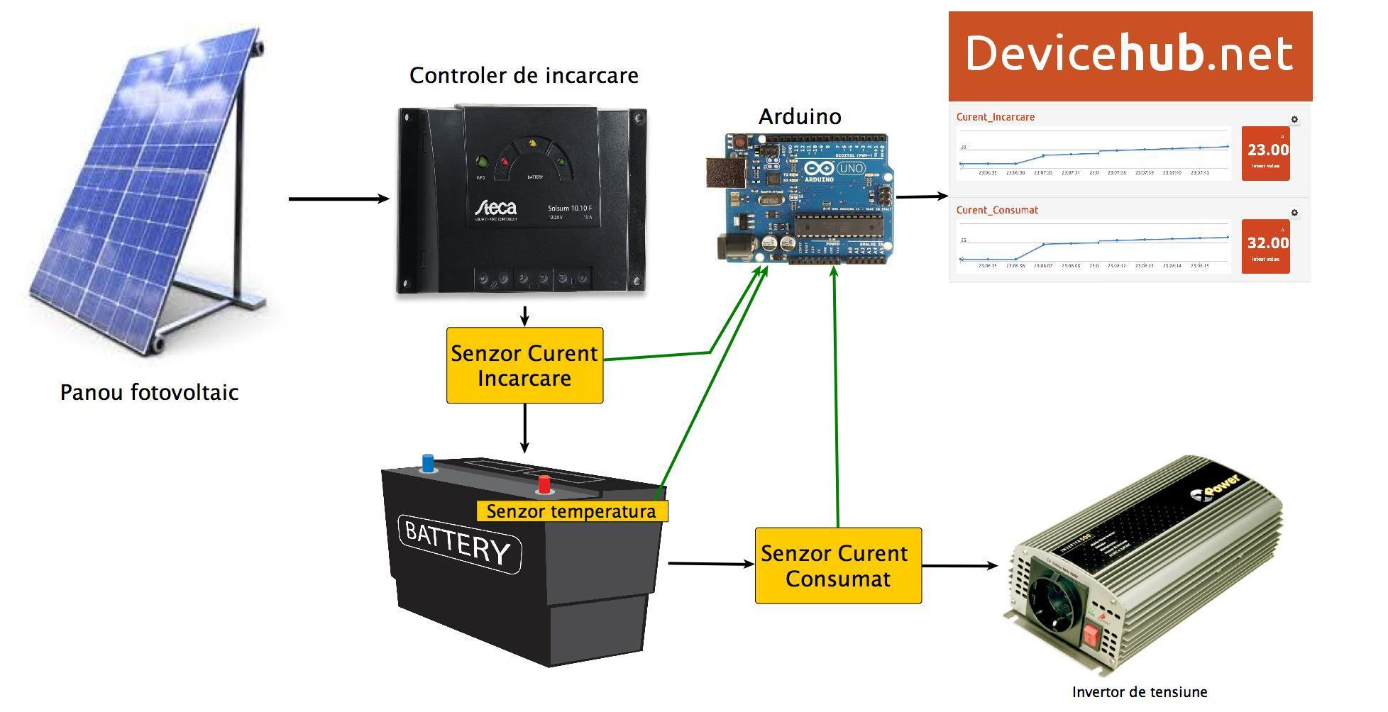 Totusi, trebuie sa stii faptul ca panourile solare reprezinta doar o componenta a unui intreg sistem care transforma lumina astfel incat sa poti beneficia de energie electrica verde, mai exact sa iti poti alimenta aparatele din casa cu energia pe care o produci. Si pentru ca suntem intr-un secol al tehnologiei, trebuie sa stii ca exista si sisteme inteligente de automatizare a casei cu ajutorul carora poti gestiona si monitoriza energia produsa prin panouri solare. Un astfel de sistem functioneaza asemenea unui UPS cand detecteaza o cadere de tensiune a retelei electrice nationale. El se conecteaza la internet si poate fi controlat de la orice computer sau smartphone. In aceeasi masura, sistemul are capacitatea de a stoca datele istorice in cloud. Un astfel de dispozitiv este alcatuit dintr-o serie de componente care au ca scop transformarea energiei, provenita de la panourile fotovoltaice, in curent alternativ. Pe partea de hardware avem nevoie de un controller de incarcare, un acumulator plumb-acid, un invertor de tensiune, o placa de dezvoltare Arduino, un modul Ethernet, un senzor de temperatura, un afisaj LCD, 2 senzori de monitorizare a curentului, 2 butoane de tipul push-button si un divizor rezistiv pentru monitorizarea tensiunii pe bateria de acumulatori, Controller-ul de incarcare este de fapt un regulator de tensiune si/sau curent care previne incarcarea excesiva a acumulatorului. La acesta sunt mai departe conectate la acumulator si invertorul, care transforma curentul continuu de 12V in curent alternativ 230V pentru a putea fi folosit in locuinta. Rolul acumulatorului este de a inmagazina, pe termen scurt, energia electrica. Pe langa aceasta va fi nevoie de Arduino. Arduino este o placa de dezvoltare open-source folosita pentru a monitoriza datele de la senzori, care, cu ajutorul modulului Ethernet, pot fi trimise automat in platforma devicehub.net. Totodata, in cazul in care nu avem conexiune la internet, aceste date pot fi afisate pe ecranul LCD. Senzorii de monitorizare a curentului sunt legati intre borna pozitiva a acumulatorului – conectorul plus al controller-ului – Arduino, respectiv o borna a invertorului – conectorul controller-ului – Arduino. Pe acumulator este pus un senzor de temperatura pentru a monitoriza caldura acestuia. Partile componente ale sistemului, precum si interactiunea dintre acestea sunt reprezentate schematic in imaginea de mai jos.