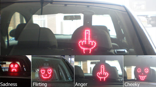 Driv-e-mocion este un dispozitiv care se ataseaza de oglinda retrovizoare si poate fi programat sa afiseze o serie de mesaje, de la fete zambarete la cuvinte. Asadar, acum poti sa spui adio plictiselii din trafic!