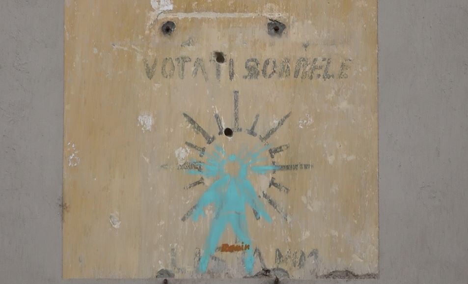 Sloganul comuniştilor încă se mai păstrează pe un perete din exterior al Casei Mincu